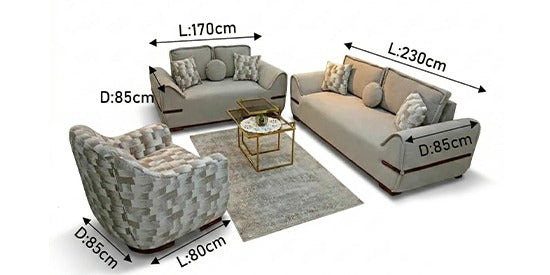 القطع الأساسية: كنبة كبيرة 230 × 85 سم، كنبة صغيرة 170 × 85 سم، كرسي 80 × 85 سم.
