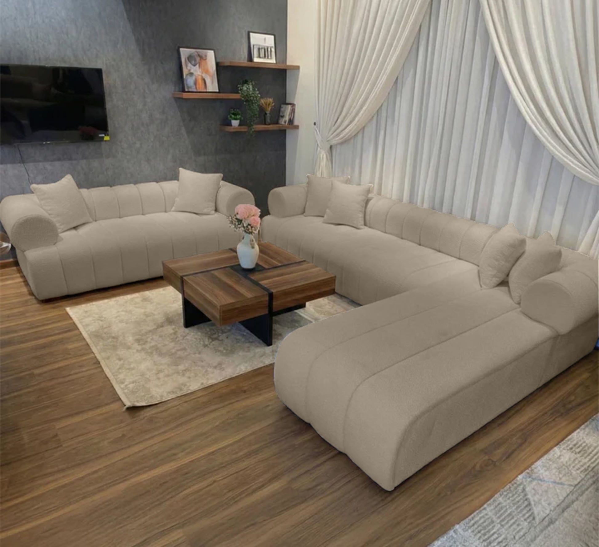 هذا التكوين يفتح المجال لإعادة ترتيب الغرفة بسهولة، ويجعل الجلسة مناسبة للمساحات المتوسطة والواسعة على حد سواء.