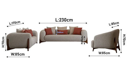 الكنبة المتوسطة (2 مقعد): العرض 170 سم، العمق 85 سم، ارتفاع الظهر 70 سم، ارتفاع القاعدة 45 سم