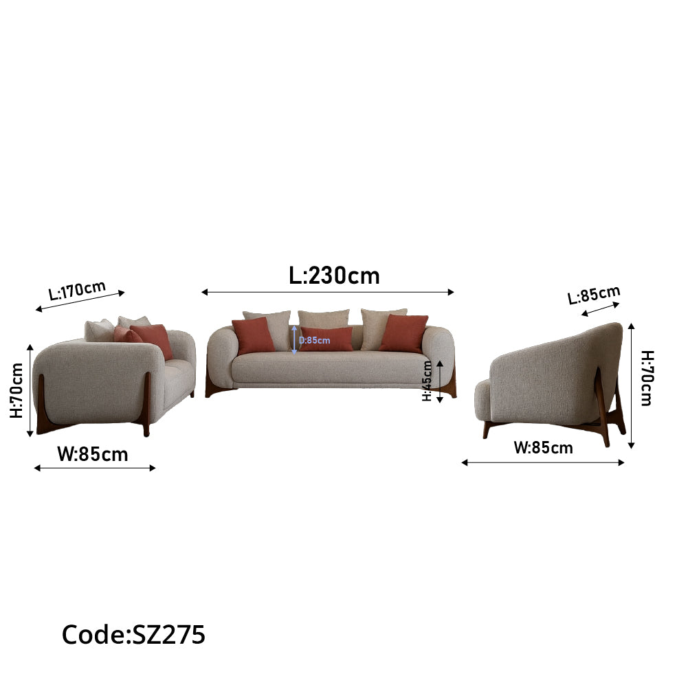 الكنبة الكبيرة (3 مقاعد): العرض 230 سم، العمق 85 سم، ارتفاع الظهر 70 سم، ارتفاع القاعدة 45 سم