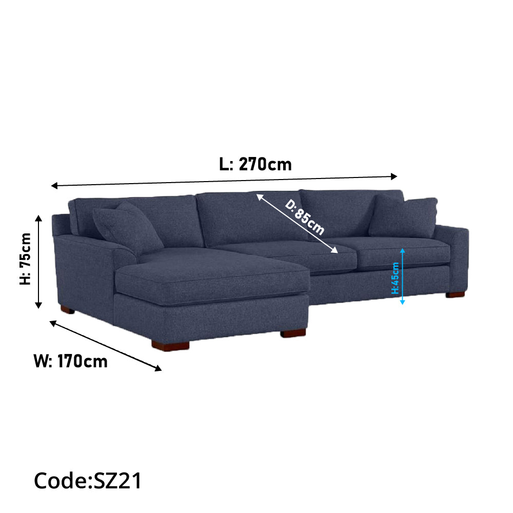 الأبعاد: العرض 270 سم، العمق 170 سم، ارتفاع القاعدة 45 سم، ارتفاع الظهر 75 سم.