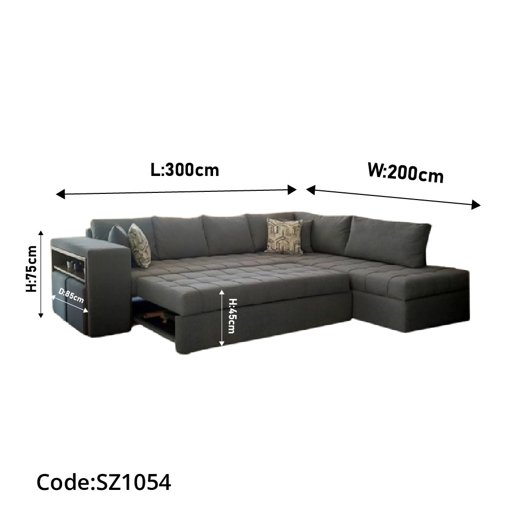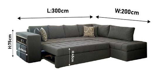 الأبعاد: 300 سم طول × 200 سم عرض، ارتفاع القاعدة 45 سم، وارتفاع الظهر 75 سم