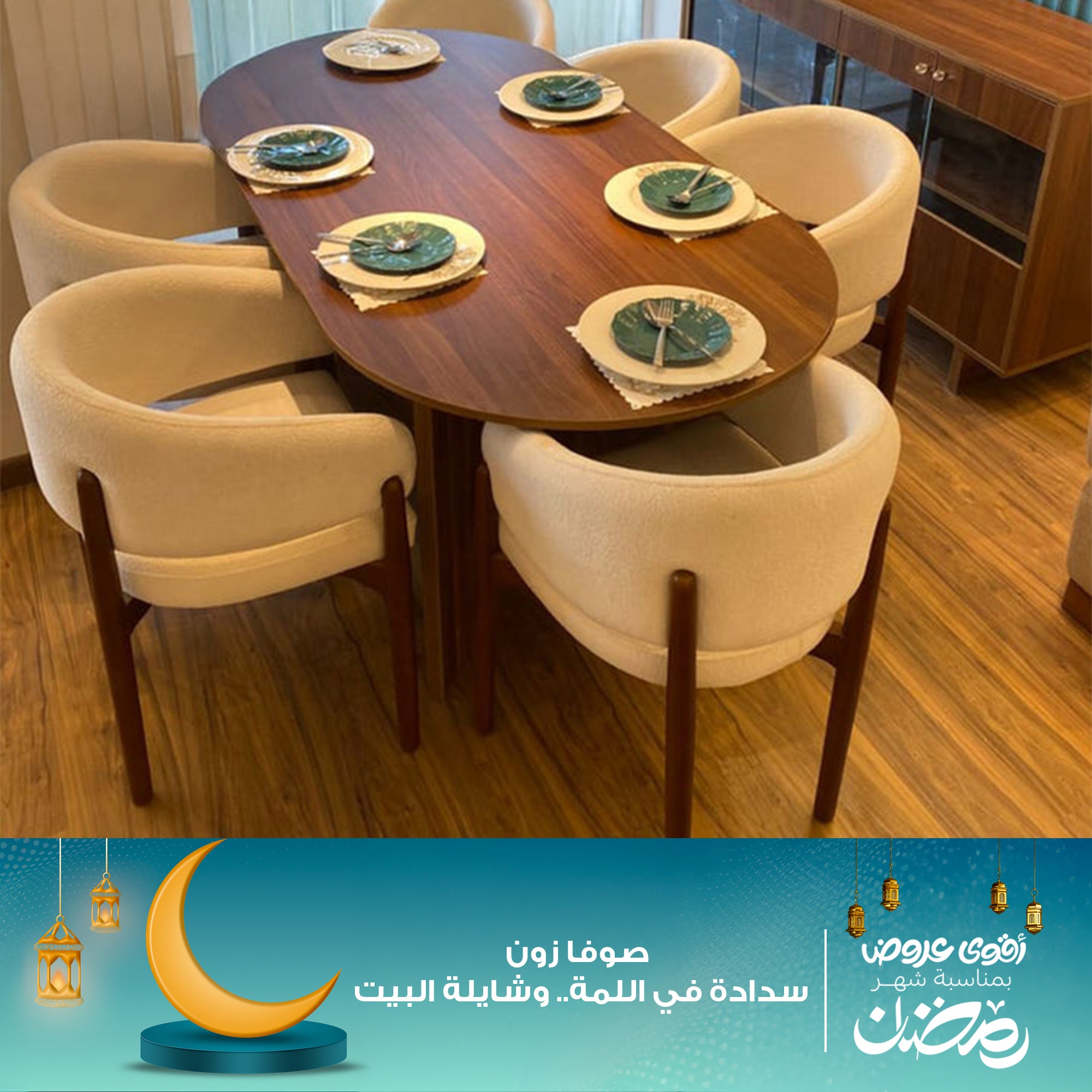 اللون الأوف وايت يمنح الغرفة إحساسًا بالاتساع والهدوء، ويجعلها قابلة للاندماج بسهولة مع أنماط ديكور مختلفة، سواء كانت عصرية، كلاسيكية هادئة، أو حتى طبيعية بدفء الخشب. تصميم السفرة بانسيابية واضحة، مع كراسي مريحة الشكل، يخلق مشهدًا متوازنًا لا يشعر المستخدم بالازدحام أو الثقل البصري.