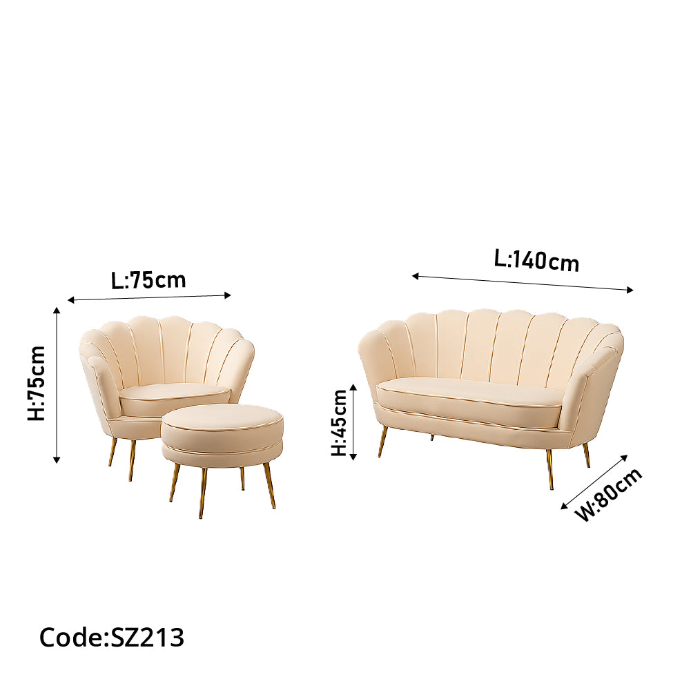 عدد القطع: ثلاث قطع (كنبة بمقاس 140×80 سم ومقعدين بعرض 75 سم لكل منهما)